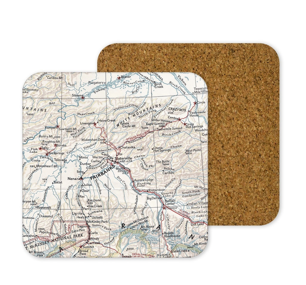 Measuring at 3-3/4" square, these coasters are made from durable hardboard with a cork back, ensuring long-lasting quality. Each set includes 4 coasters. Adds a touch of wanderlust to any home or office space. Protects surfaces while providing a unique conversation starter.