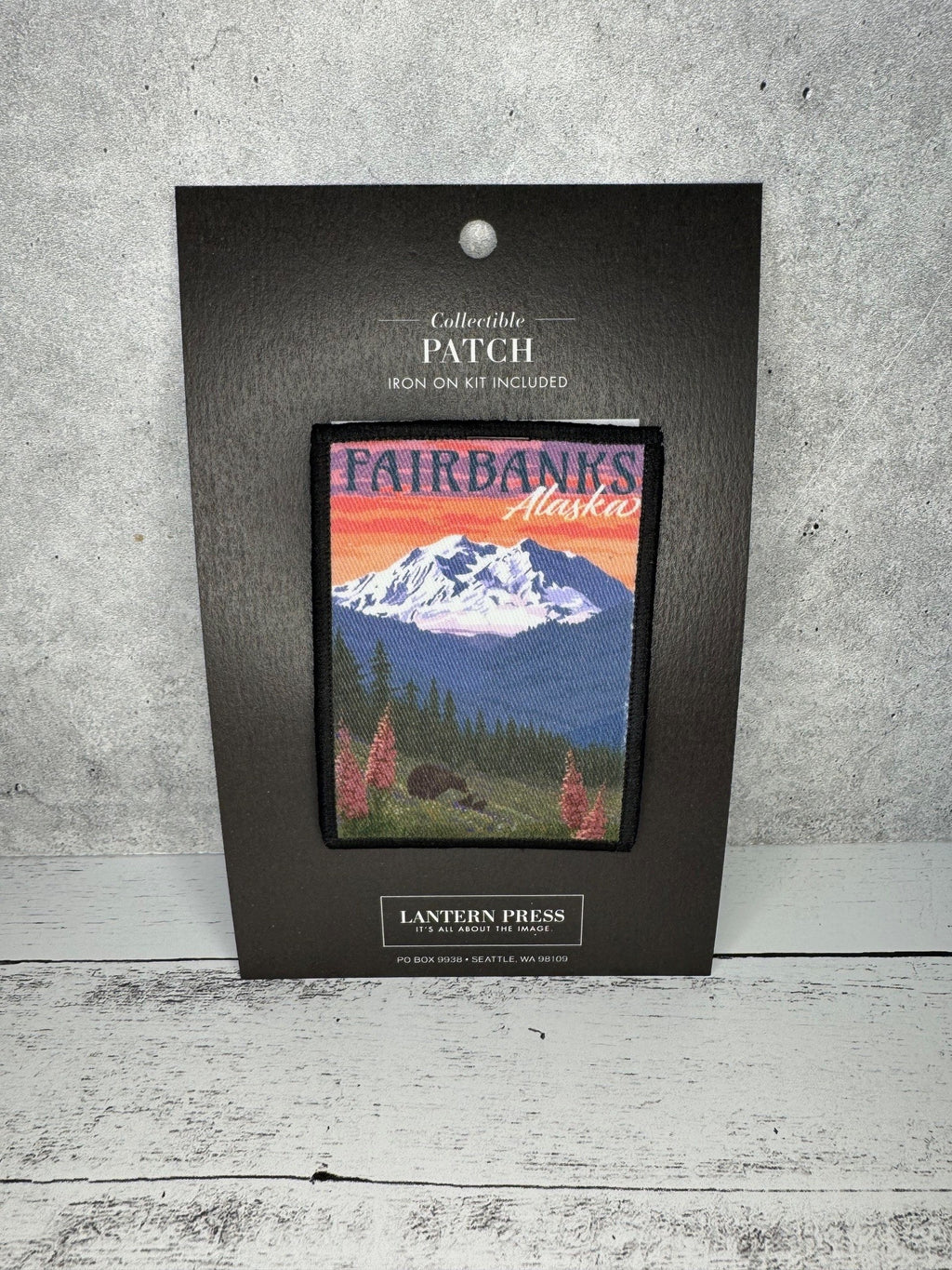 Fairbanks Alaska iron on patch featuring the Northern Lights or Moose and Baby with mountains. Printed in the USA. Measures 3.75" x 2.5".